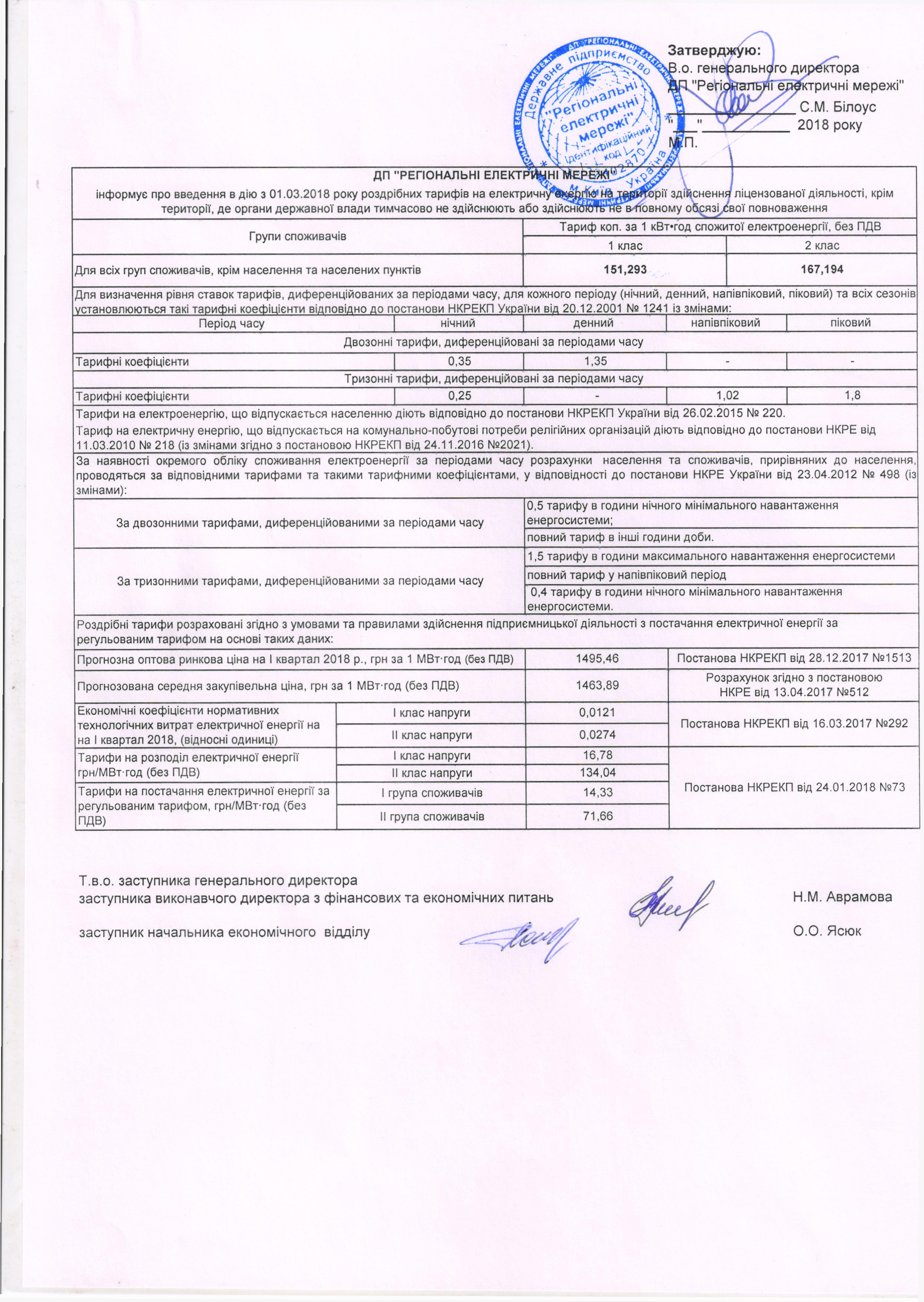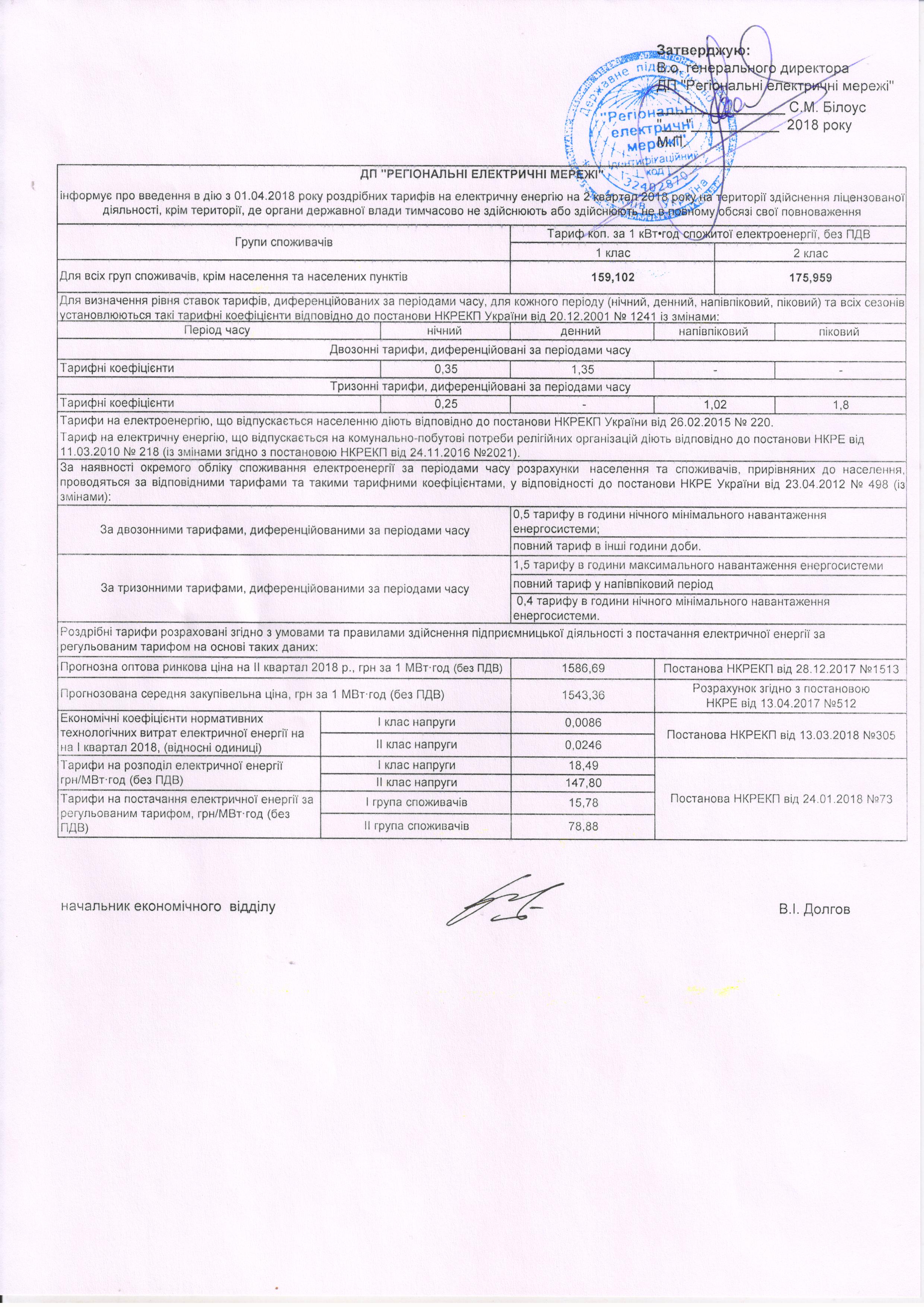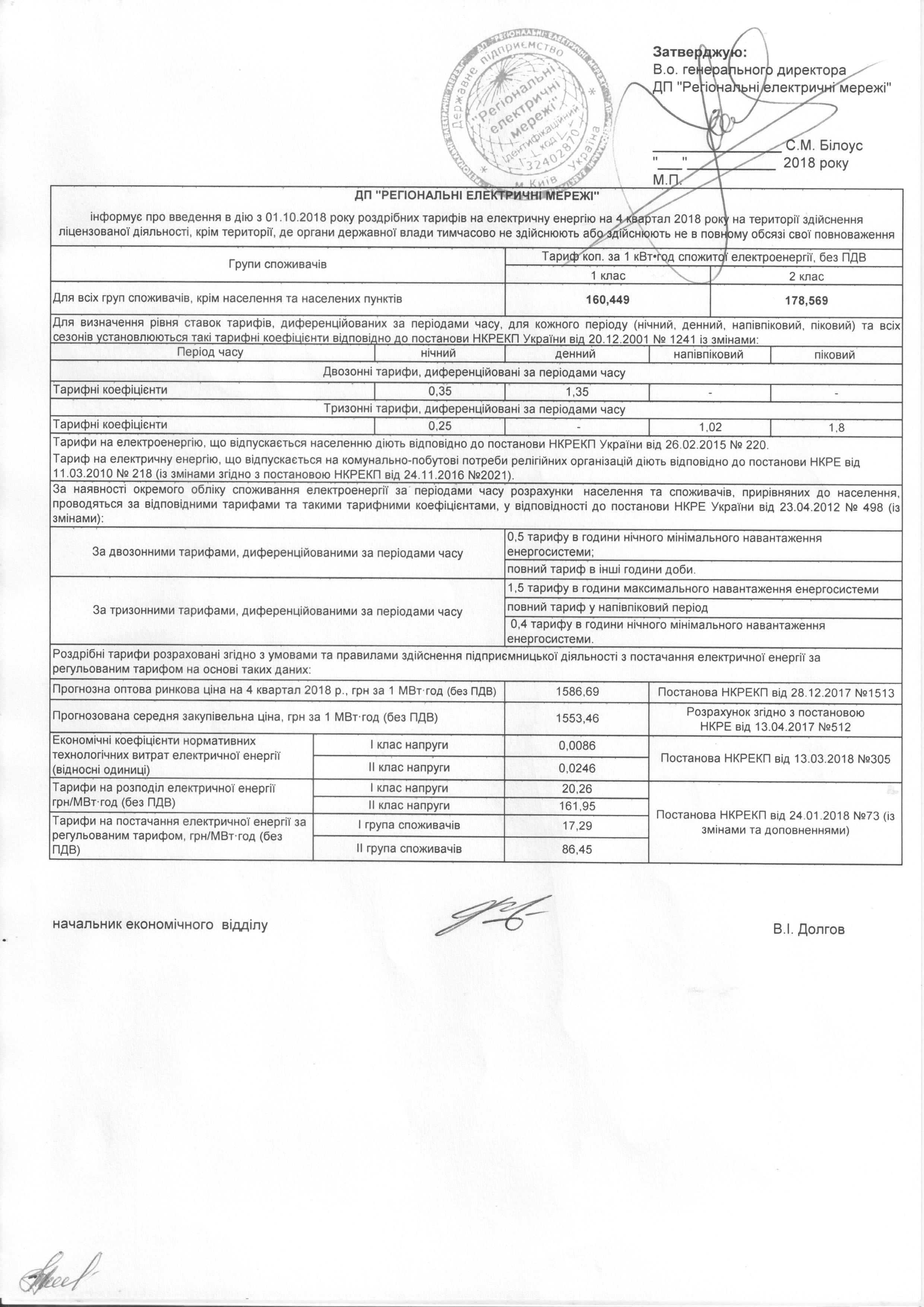 Тарифи на послуги з розподілу електричної енергії ДП “РЕГІОНАЛЬНІ ЕЛЕКТРИЧНІ МЕРЕЖІ” з 01.08.2020